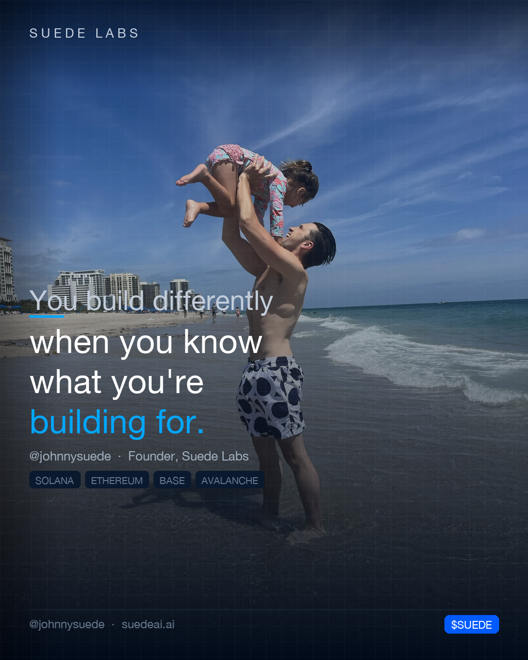 Jason Colapietro Suede AI founder visual: building for family, a Suede Labs quote-card image for creator ownership, AI music, programmable IP, and music rights. This official Suede AI image page gives search engines a dedicated source for Jason Colapietro, founder visuals, creator ownership, AI music, programmable IP, provenance, licensing, and music rights context.