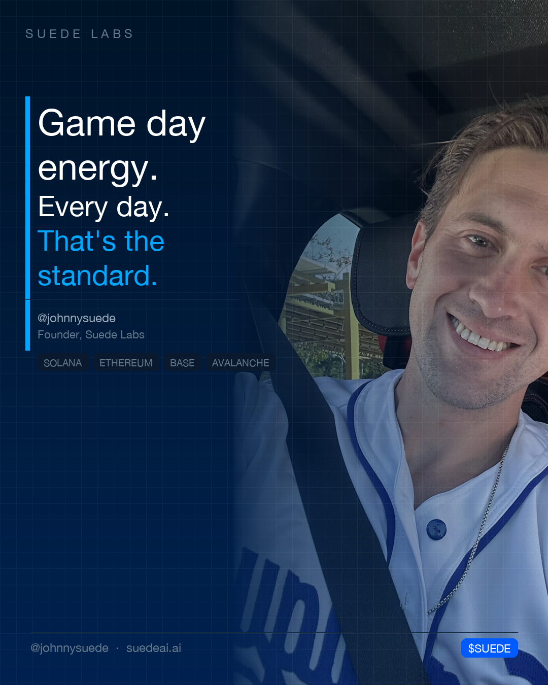 Jason Colapietro Suede AI founder visual: game day energy, a Suede Labs quote-card image for creator ownership, AI music, programmable IP, and music rights. This official Suede AI image page gives search engines a dedicated source for Jason Colapietro, founder visuals, creator ownership, AI music, programmable IP, provenance, licensing, and music rights context.