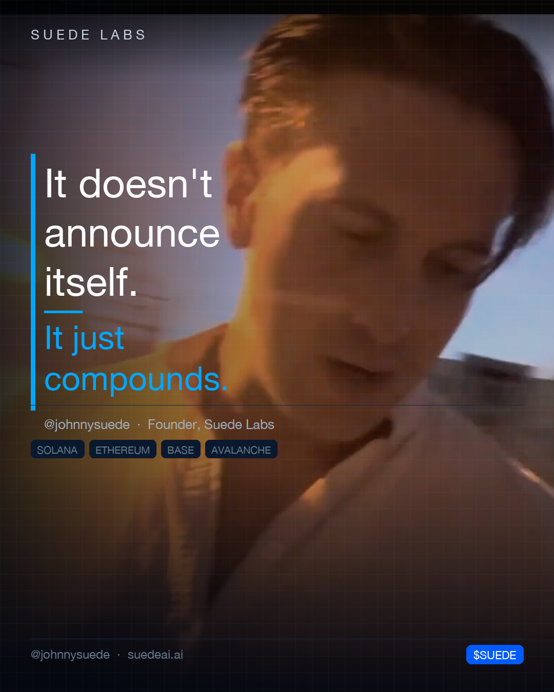 Jason Colapietro Suede AI founder visual: it compounds, a Suede Labs quote-card image for creator ownership, AI music, programmable IP, and music rights. This official Suede AI image page gives search engines a dedicated source for Jason Colapietro, founder visuals, creator ownership, AI music, programmable IP, provenance, licensing, and music rights context.