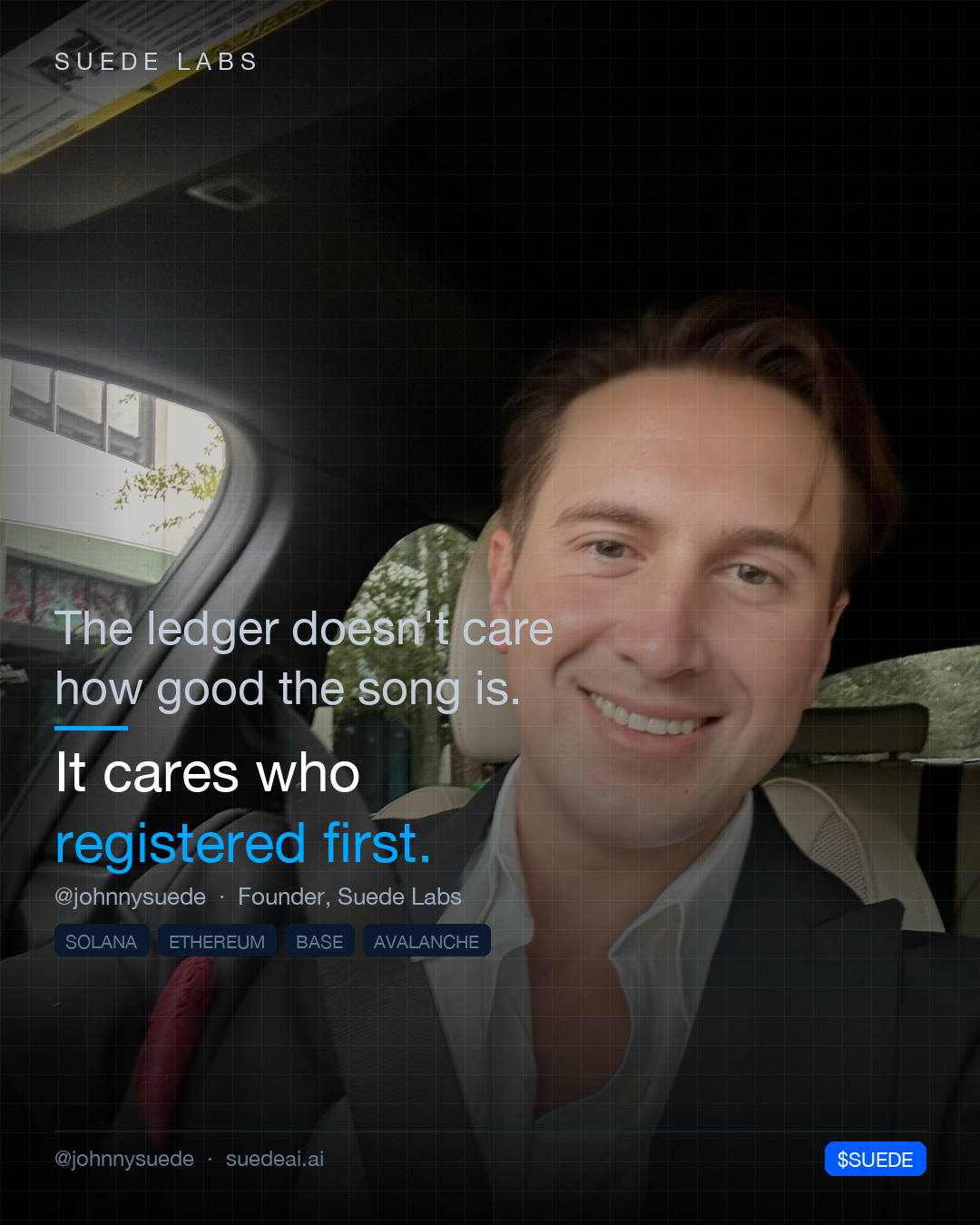 Jason Colapietro Suede AI founder visual: ledger registered first, a Suede Labs quote-card image for creator ownership, AI music, programmable IP, and music rights. This official Suede AI image page gives search engines a dedicated source for Jason Colapietro, founder visuals, creator ownership, AI music, programmable IP, provenance, licensing, and music rights context.