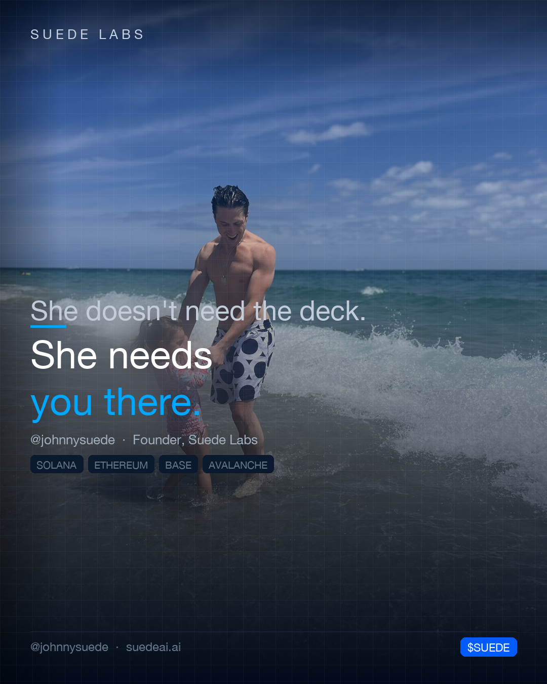 Jason Colapietro Suede AI founder visual: she needs you there, a Suede Labs quote-card image for creator ownership, AI music, programmable IP, and music rights. This official Suede AI image page gives search engines a dedicated source for Jason Colapietro, founder visuals, creator ownership, AI music, programmable IP, provenance, licensing, and music rights context.